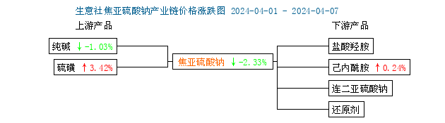 截至4月7日,國內(nèi)純堿價(jià)格偏弱運(yùn)行,整體下跌1.03%,硫磺價(jià)格小幅回升,整體上漲2.80%,綜合來看,原料成本整體仍處低位,純堿價(jià)格跌幅有所放緩,原料成本震蕩前行,后市焦亞硫酸鈉價(jià)格弱勢有望企穩(wěn)。