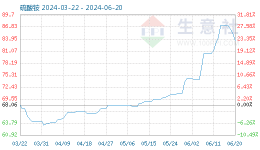 據(jù)生意社商品行情分析系統(tǒng),6月18日國內(nèi)硫酸銨市場均價為1033元/噸,較6月10日國內(nèi)硫酸銨市場均價961元/噸,國內(nèi)硫酸銨市場價格上漲幅度為7.45%。