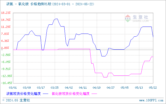 近日(5.13-5.22)液氨市場行情大幅上漲,氯化銨成本支撐走強(qiáng)。據(jù)生意社商品行情分析系統(tǒng)顯示,截至5月22日液氨價(jià)格在3320元/噸,較13日3190元/噸上漲了4.08%。